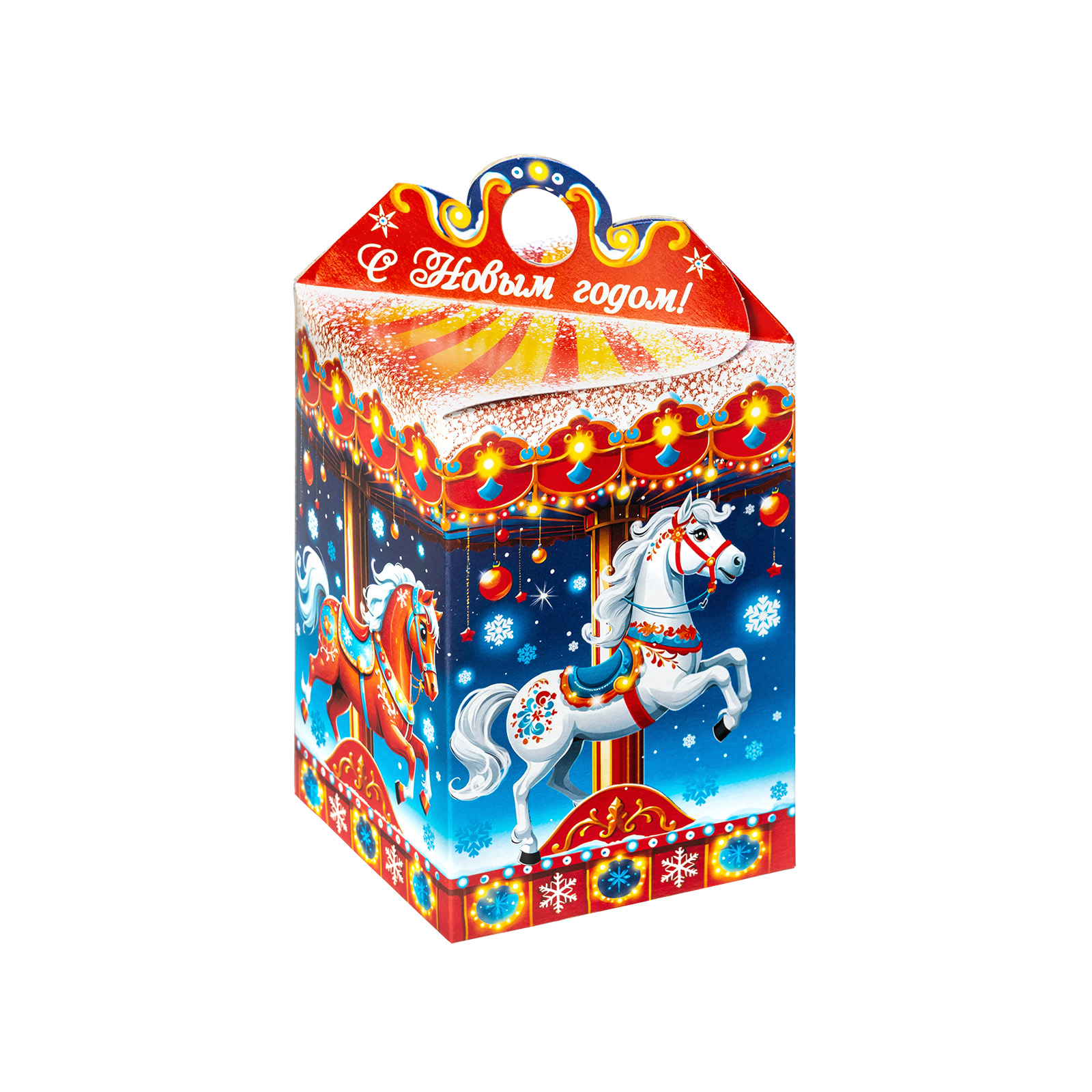 Прекрасный новогодний сладкий подарок, который поднимет настроение сластене абсолютно любого возраста. Это небольшая картонная коробочка в форме фонарика, украшенная одной большой яркой композицией. С каждой стороны нарисованы грациозные лошадки, прям как на той самой карусели из парка аттракционов! Сверху и снизу упаковки тянутся контрастные линии, украшенные новогодними символами, а на крышке есть небольшая удобная ручка и поздравительная надпись. Такой подарок будет к месту как на детском празднике, так и на корпоративе - каждый найдет в этом наборе для себя что-то приятное и теплое.