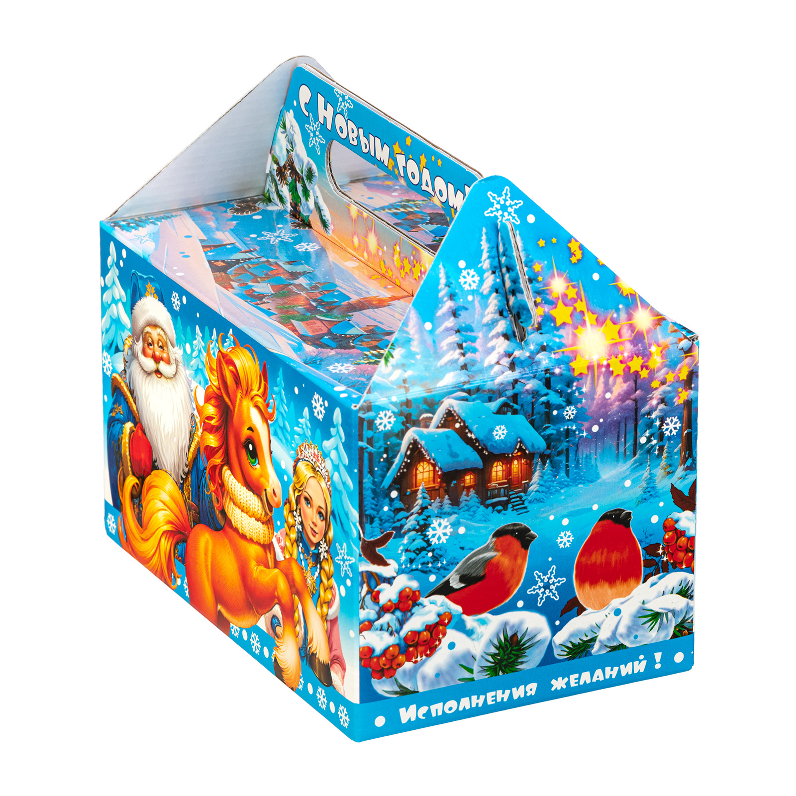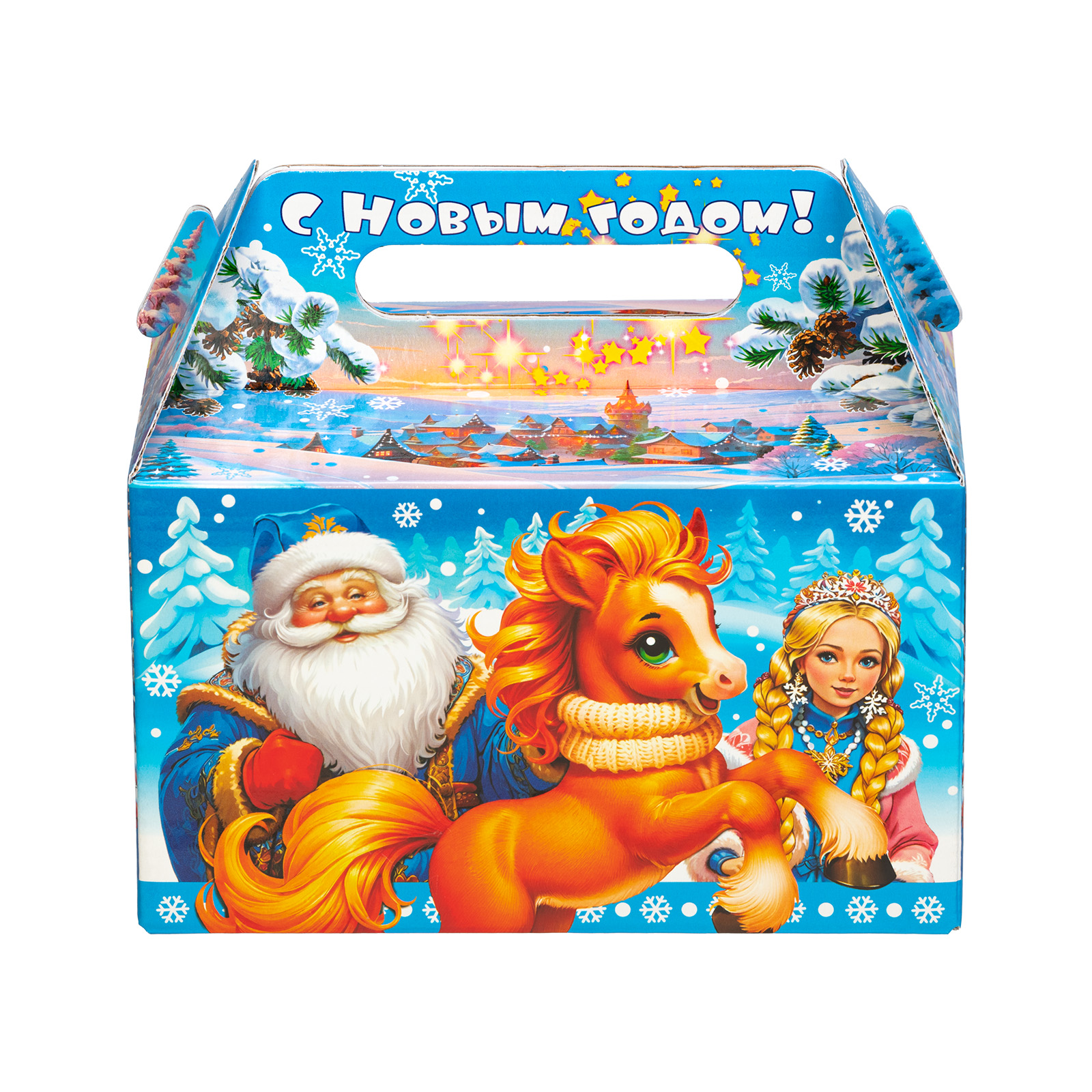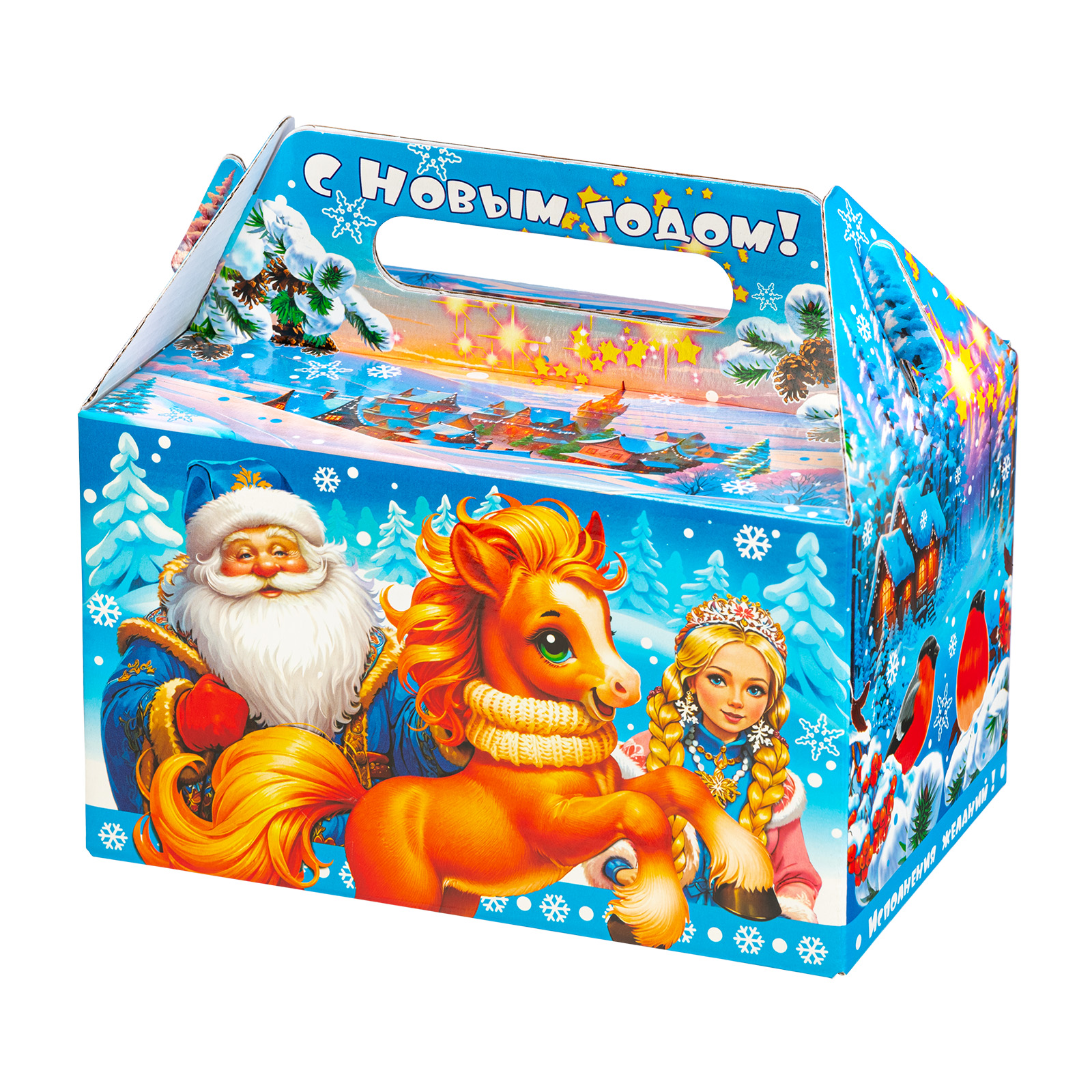 Прекрасный новогодний сладкий подарок, который легко поднимет настроением всем любителям сладостей. Набор “Огоньки” - это сочетание яркой привлекательной упаковки и большого количества сладостей на любой вкус. Подарочная упаковка представляет собой небольшой сундучок нежно-голубого цвета, на котором изображена завораживающая зимняя природа и главные символы праздника - Дед Мороз, Снегурочка и небольшая огненно-рыжая лошадка. В состав подарка входит более килограмма лакомств и небольшой памятный сувенир с изображением символа наступающего года!