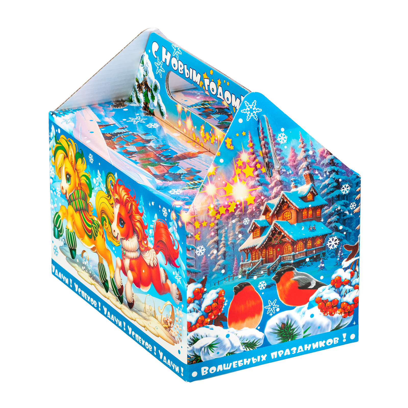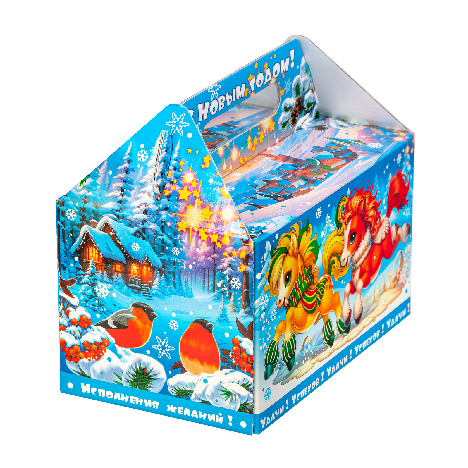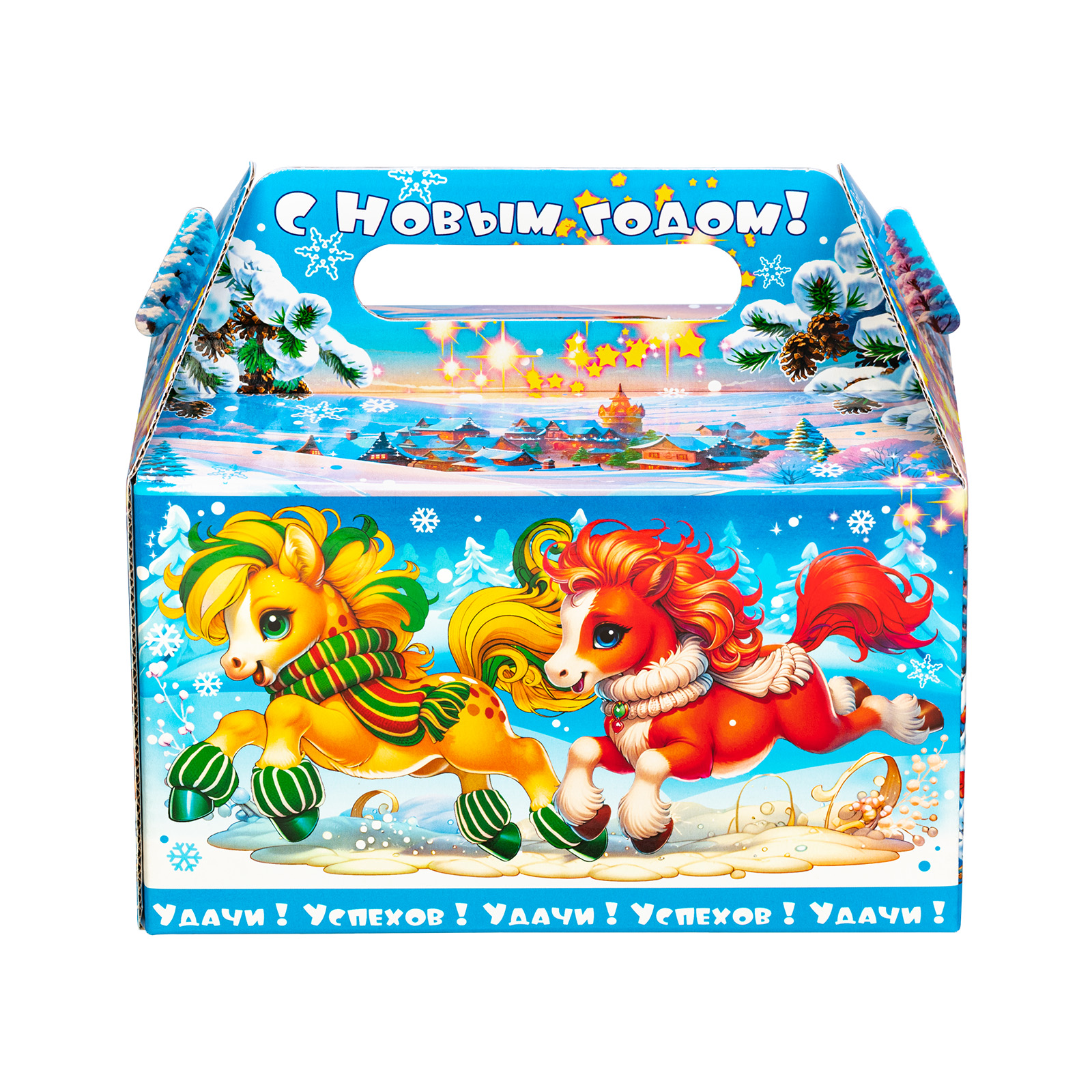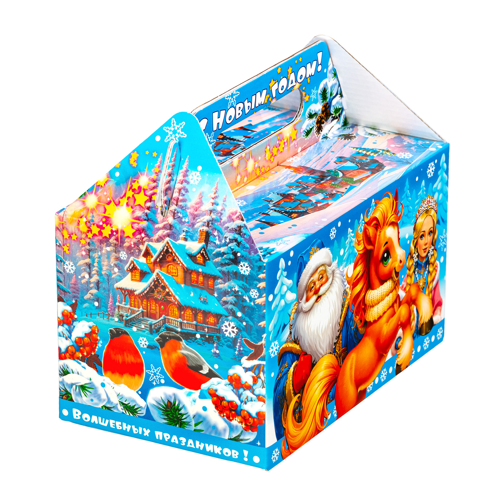 Прекрасный новогодний сладкий подарок, который легко поднимет настроением всем любителям сладостей. Набор “Огоньки” - это сочетание яркой привлекательной упаковки и большого количества сладостей на любой вкус. Подарочная упаковка представляет собой небольшой сундучок нежно-голубого цвета, на котором изображена завораживающая зимняя природа и главные символы праздника - Дед Мороз, Снегурочка и небольшая огненно-рыжая лошадка. В состав подарка входит более килограмма лакомств и небольшой памятный сувенир с изображением символа наступающего года!